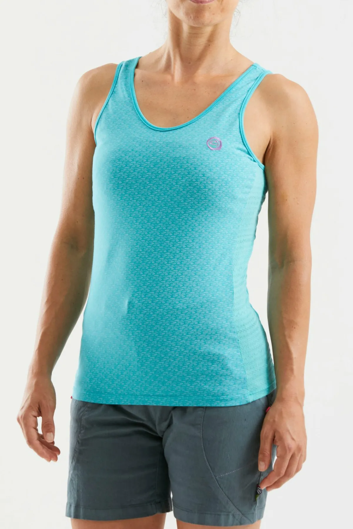 Camiseta De Tirantes En Tejido Bielástico Y Tejido Jacquard En Laterales. Bordado En El Lado Del Corazón. Estampado En El Frente. Línea De Concepto Urbano. El Mejor Confort. Fabricado En Italia.